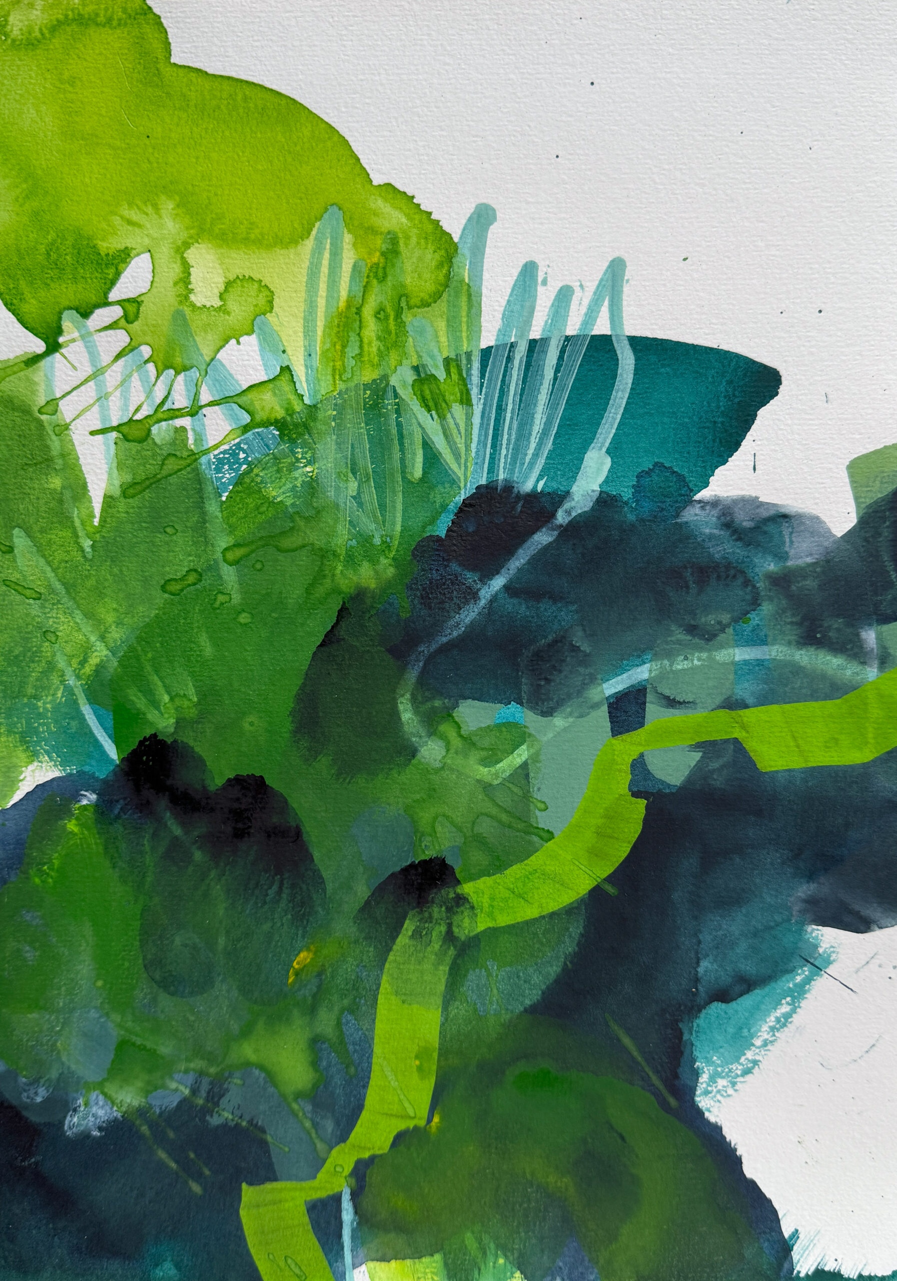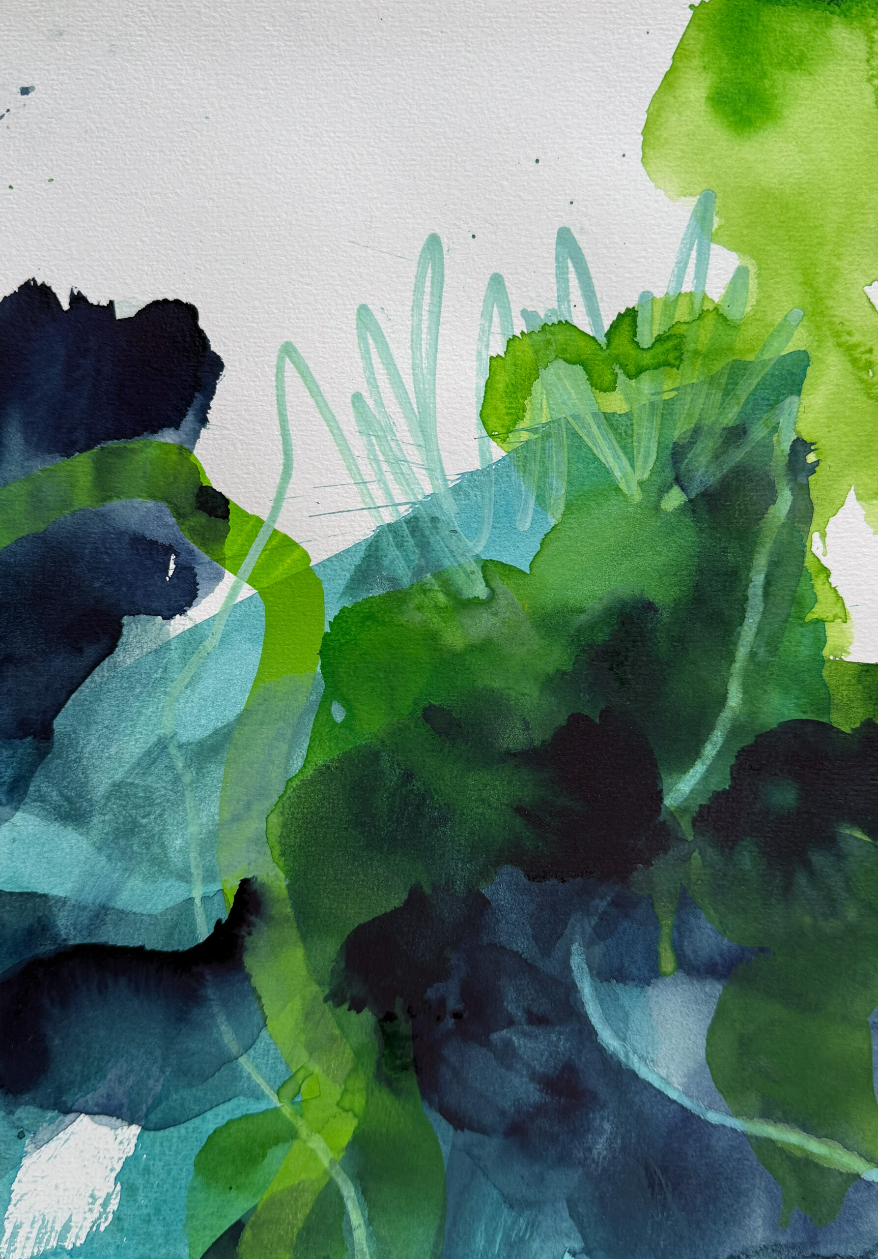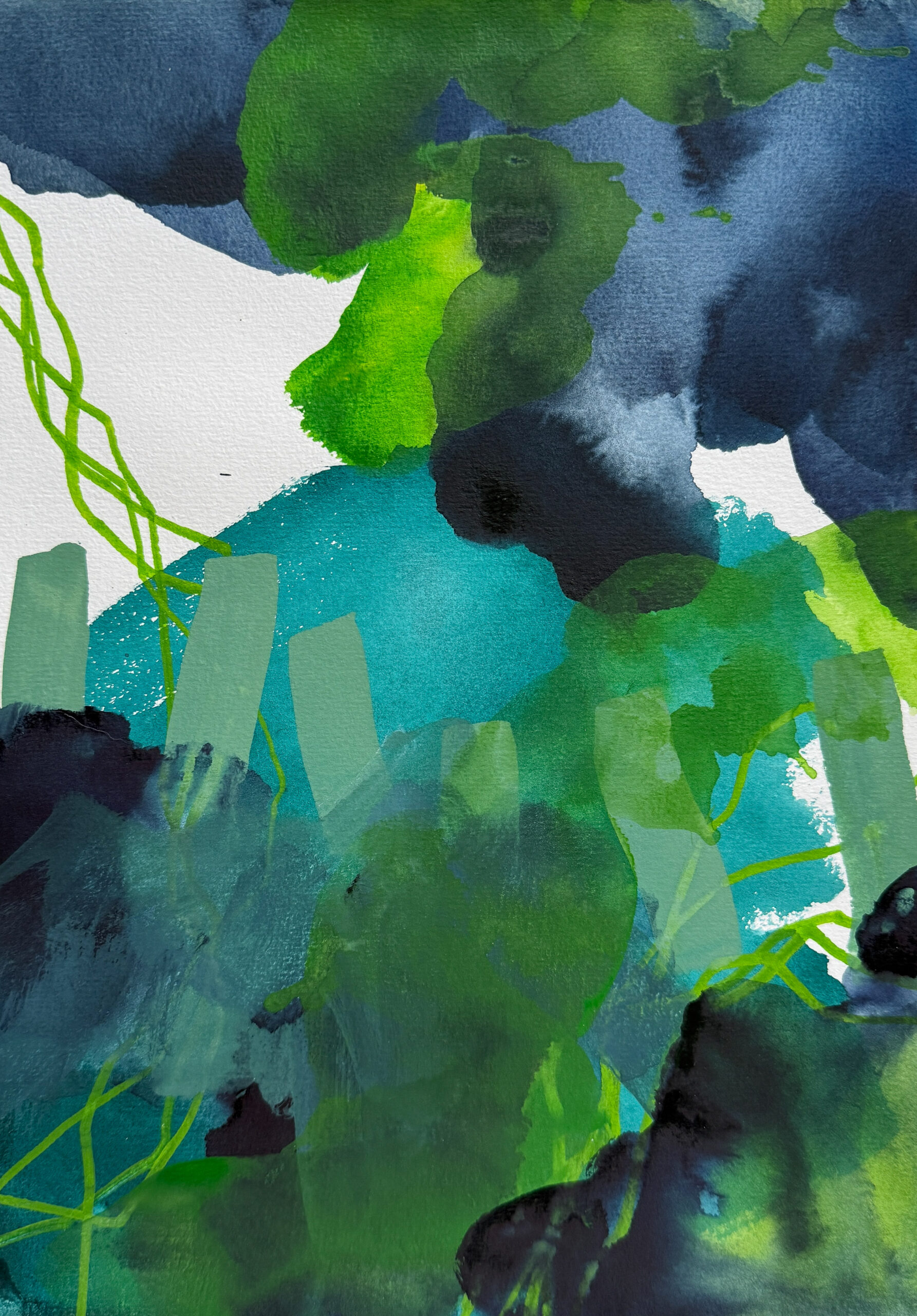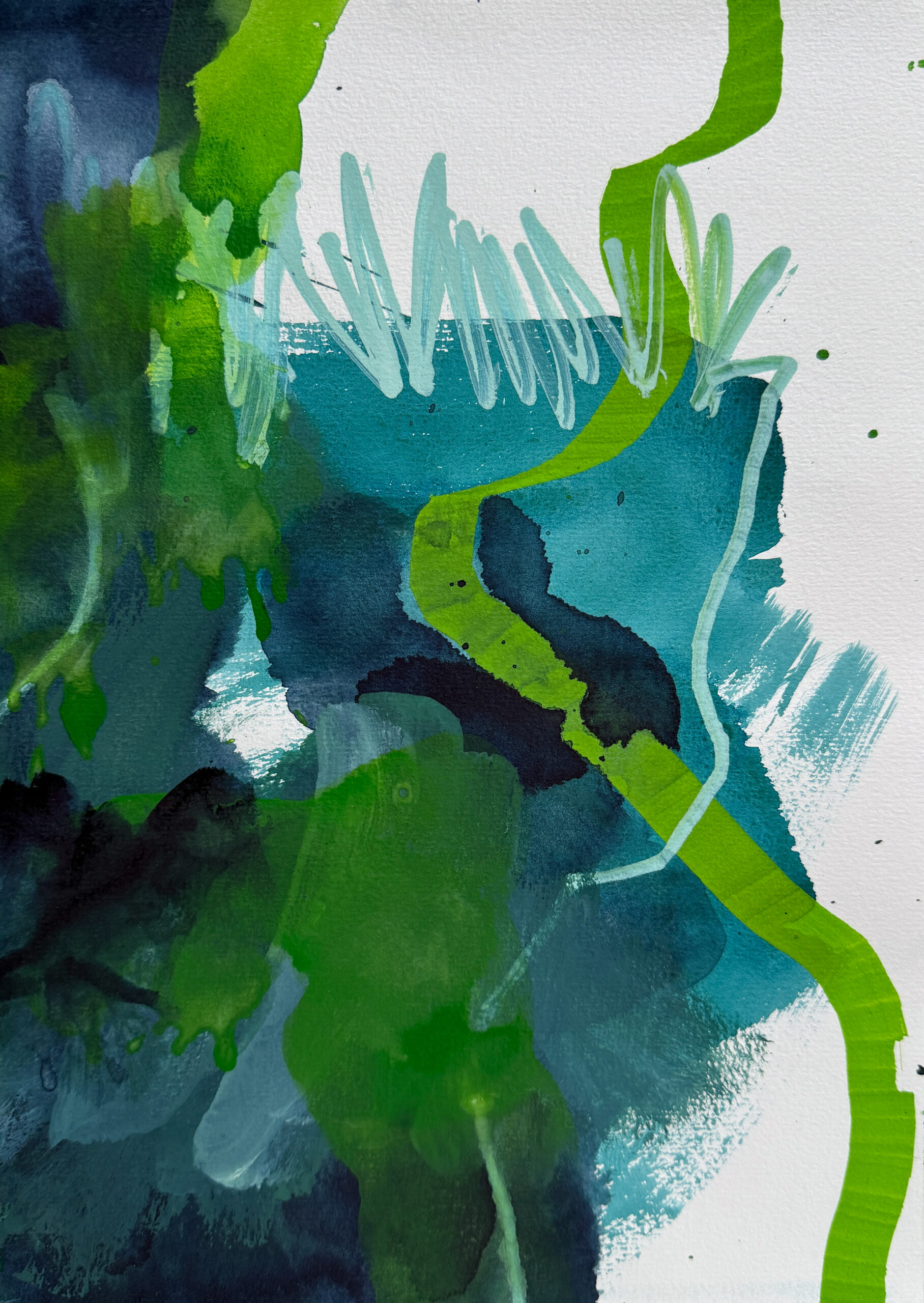 2025, greenandblue travellers IV, watercolour and acrylics on paper, 29,5, x 21 cm