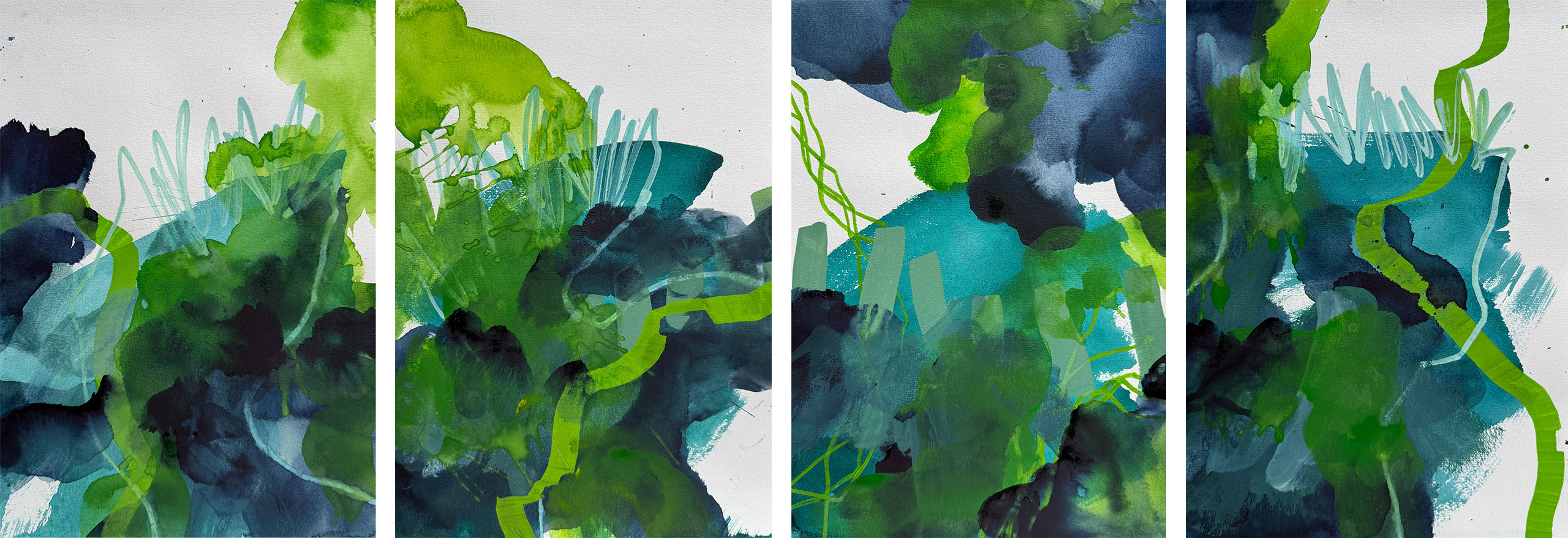2025, greenandblue travellers I-IV, watercolour and acrylics on paper, 29,5, x 21 cm
